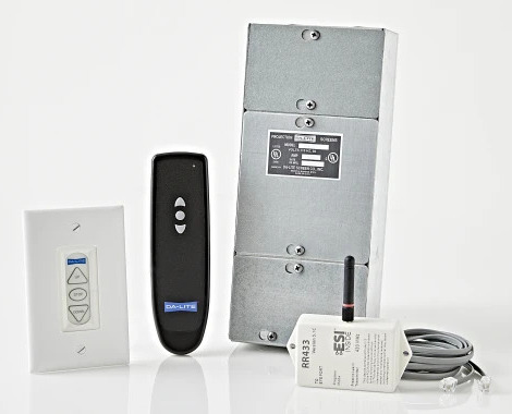 This system include an external Low Voltage Controller (LVC), white 3-button LVC wall switch and radio-frequency 3-button remote control consisting of a transmitter and receiver. It has a range of operation up to 75 feet.