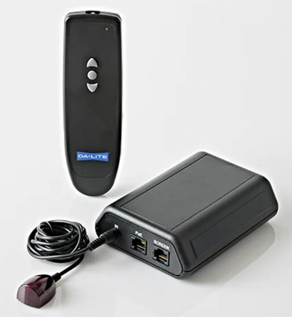 This kit also includes an IR remote transmitter and receiver, which connects to the Screen Controller to provide remote functionality for operation up to 50' away. It is ideal for rooms with RF interference. The receiver is compatible with third-party controllers that can learn IR codes. (AAA batteries are included.)